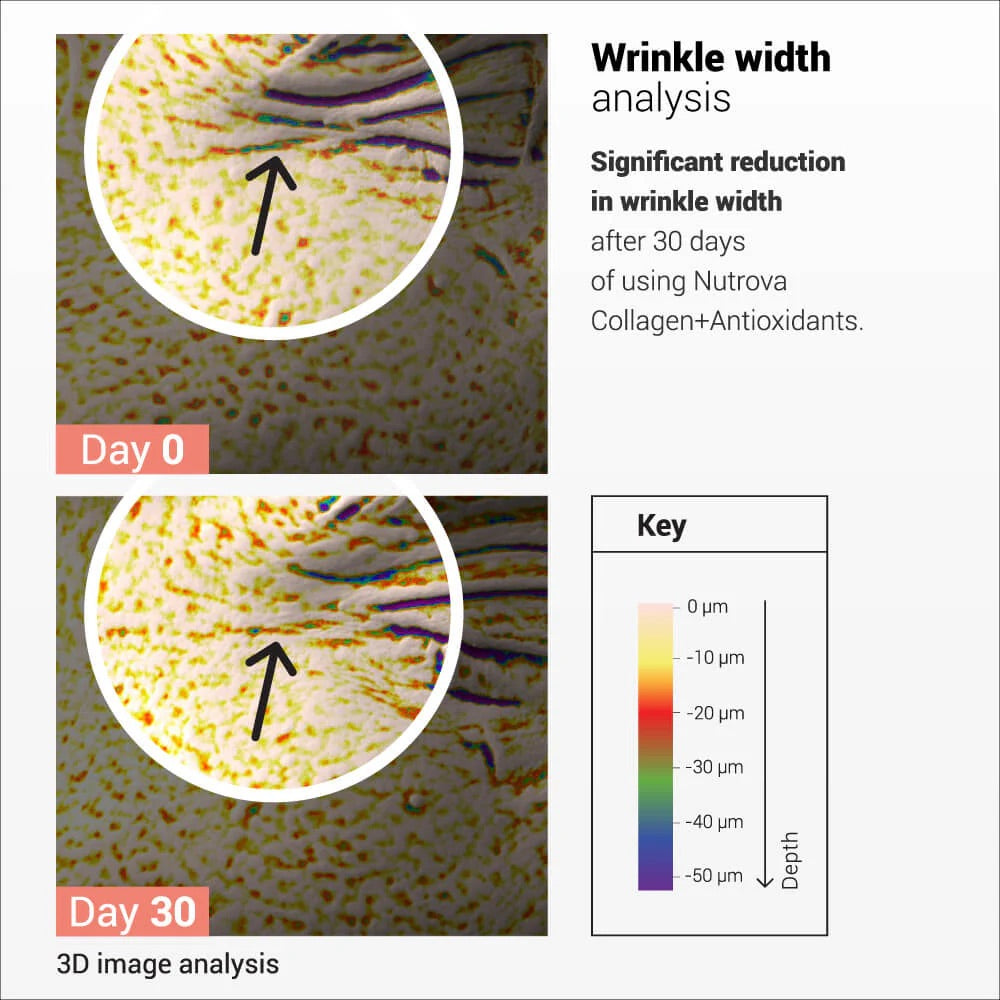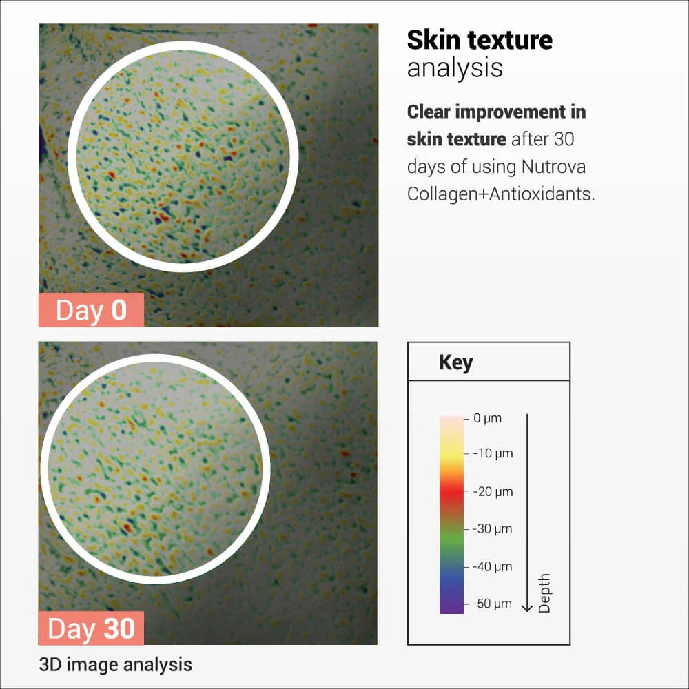 After 30 days of the participants consuming Nutrova Collagen+Antioxidants, significant improvements were seen in several parameters of the participants' skin health.