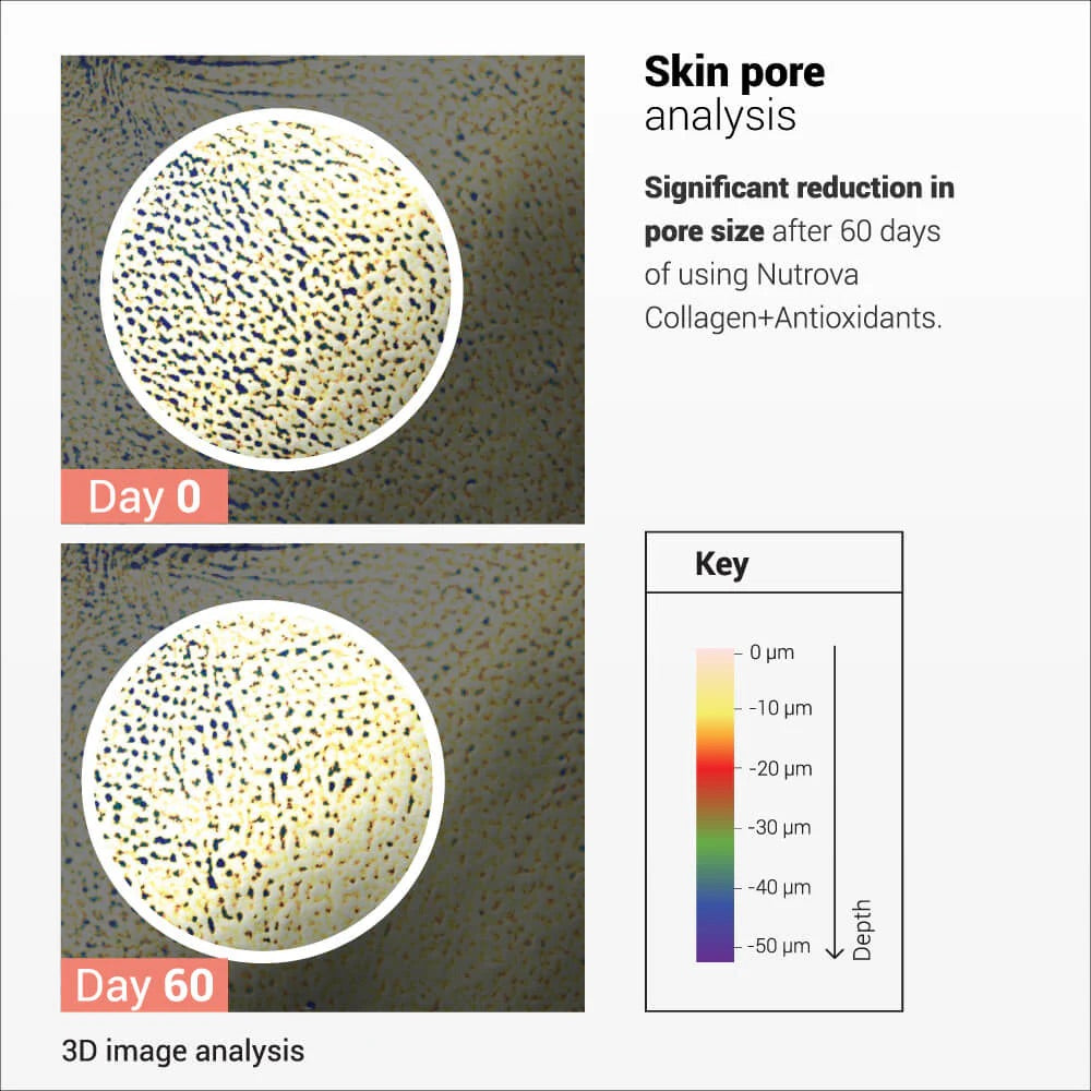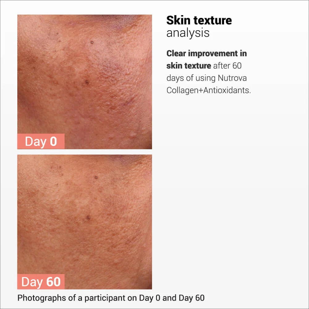 These results show that Nutrova Collagen+Antioxidants significantly improved parameters of skin health like hydration, firmness, elasticity, pore size, pigmentation, and texture, when taken daily for 30 and 60 days.