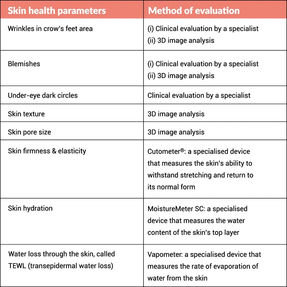 During the study, participants were asked to refrain from using any supplement, topical sunscreen, anti-aging creams/serums, masks, or undergoing any skin treatments, or massages, to minimise discrepancies.