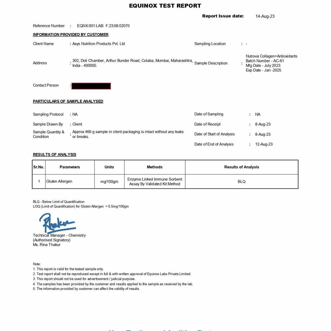 Nutrova Collagen+Antioxidants is also tested for Gluten to ensure suitability for individuals who avoid gluten.