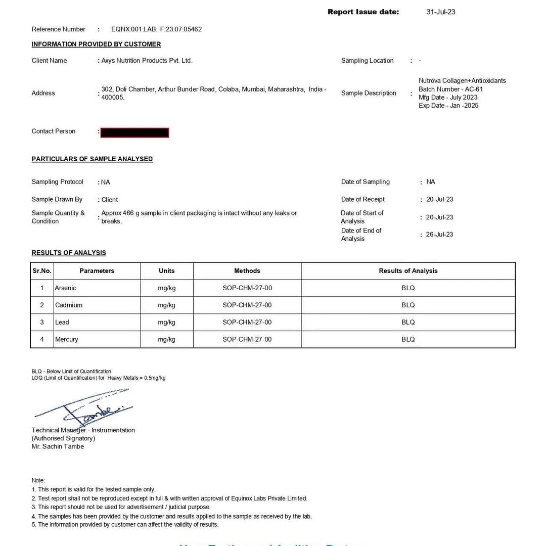 Each batch of Nutrova Collagen+Antioxidants is tested for heavy metals to ensure product safety.